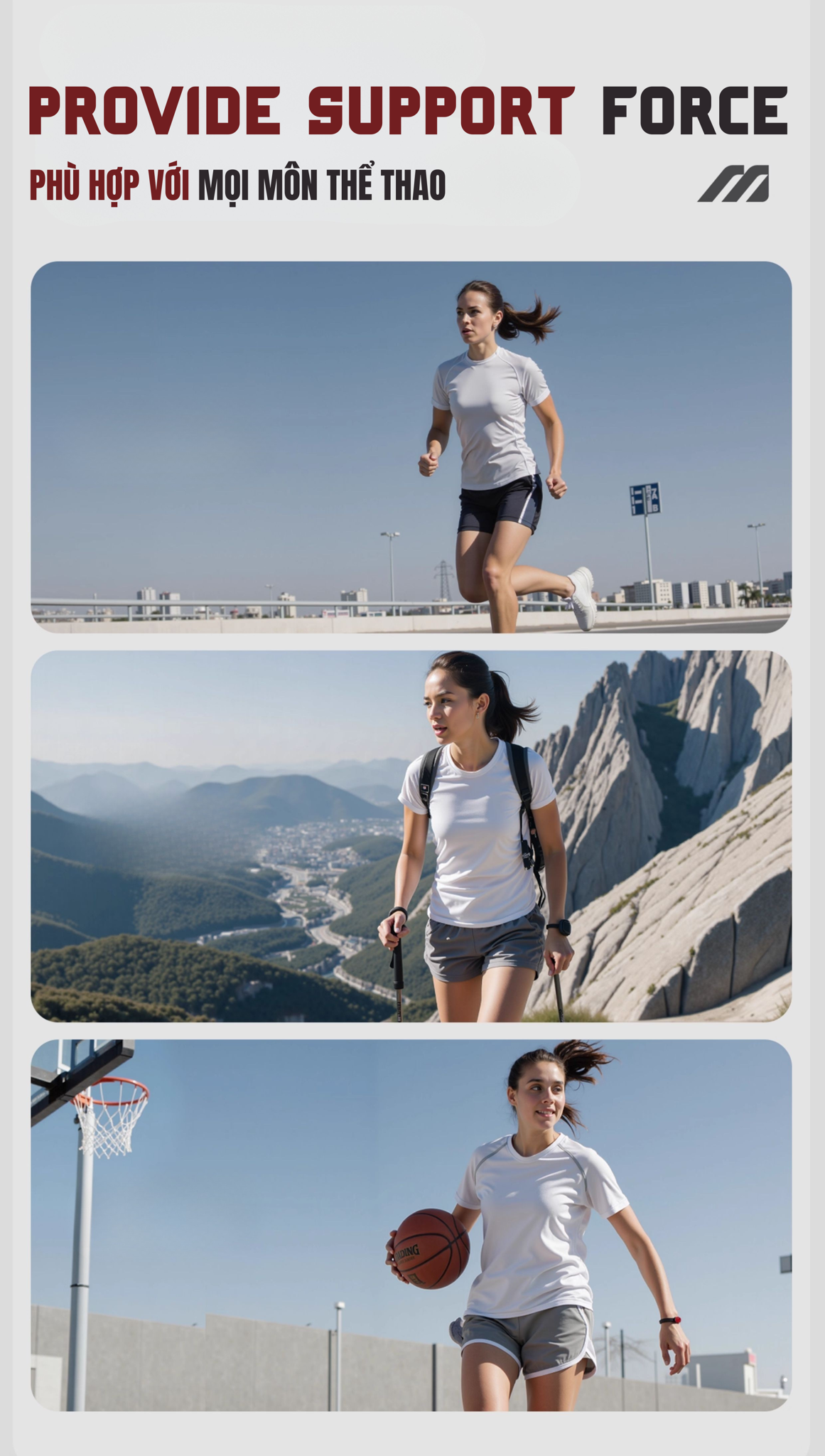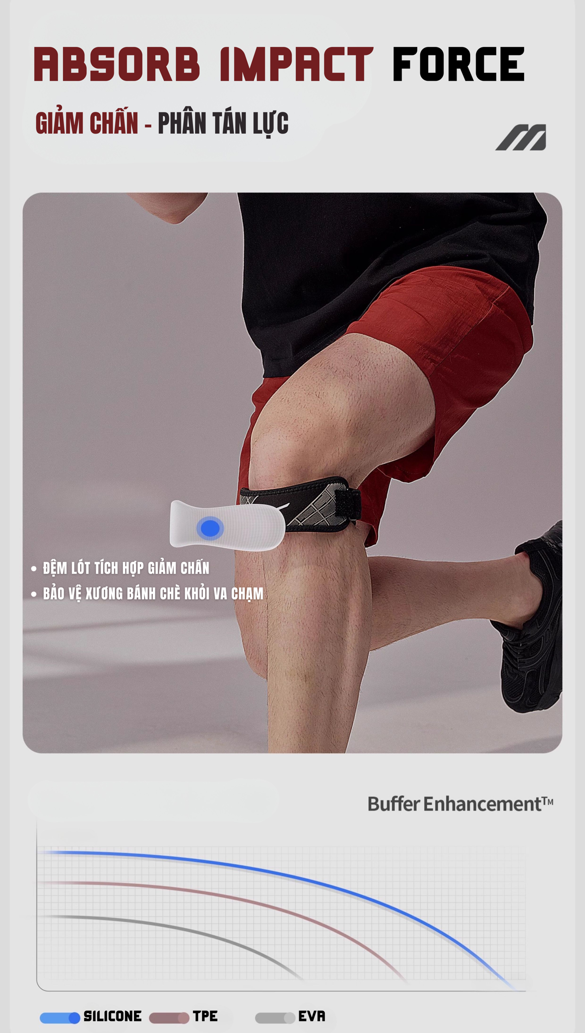 - Mặt vải chính: 100% Cotton - Bề mặt bóng: 100% Polyamide (sợi tổng hợp polyester) - Lớp dính: 100% Cotton - Co giãn đa hướng – Elastic high-stretch fabric - Công nghệ dệt kim mật độ cao, hạn chế bai dão, không xù lông. - Kết cấu ép chính xác – Precision-engineered: Thiết kế ép hai chiều ổn định, không bị trượt. Dây nén đàn hồi giúp cố định chắc chắn, hỗ trợ giảm áp lực lên khớp gối. - Giảm chấn hiệu quả – Absorb impact force: Tích hợp miếng đệm giảm chấn phân tử cao (High Polymer Cushion Pad). Giảm 98% lực va đập lên xương bánh chè, bảo vệ đầu gối khỏi chấn thương.