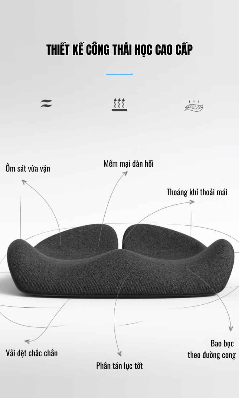 Thông số kĩ thuật: 1. Thông tin chung - Chất liệu lõi: Mút nhớ (Memory Foam) đàn hồi chậm 5 giây - Chất liệu vỏ: Vải lưới cao cấp thoáng khí, thân thiện với da - Độ đàn hồi: Cao – phục hồi hình dạng sau 3–5 giây - Độ thoáng khí: Tăng 50% so với đệm ngồi thông thường - Khả năng chịu lực: Tối đa 100 kg - Kích thước (ước tính): 45 × 35 × 10 cm - Trọng lượng: Khoảng 0.8–1.2 kg 2. Thiết kế & cấu trúc - Thiết kế công thái học (Ergonomic Design): + Dáng cong ôm sát hông và đùi, giảm áp lực vùng xương chậu. + Vùng lõm giữa hỗ trợ lưu thông khí, giúp khô thoáng khi ngồi lâu. + Hai bên bo cong ôm nhẹ giúp cố định tư thế ngồi tự nhiên. - Phân khu giảm áp: + Phần trước nhô cao – chống tê chân. + Phần sau lõm sâu – giảm áp cột sống và vùng mông. + Cấu trúc phân tán áp lực giúp giảm hơn 50% áp lực lên xương cụt