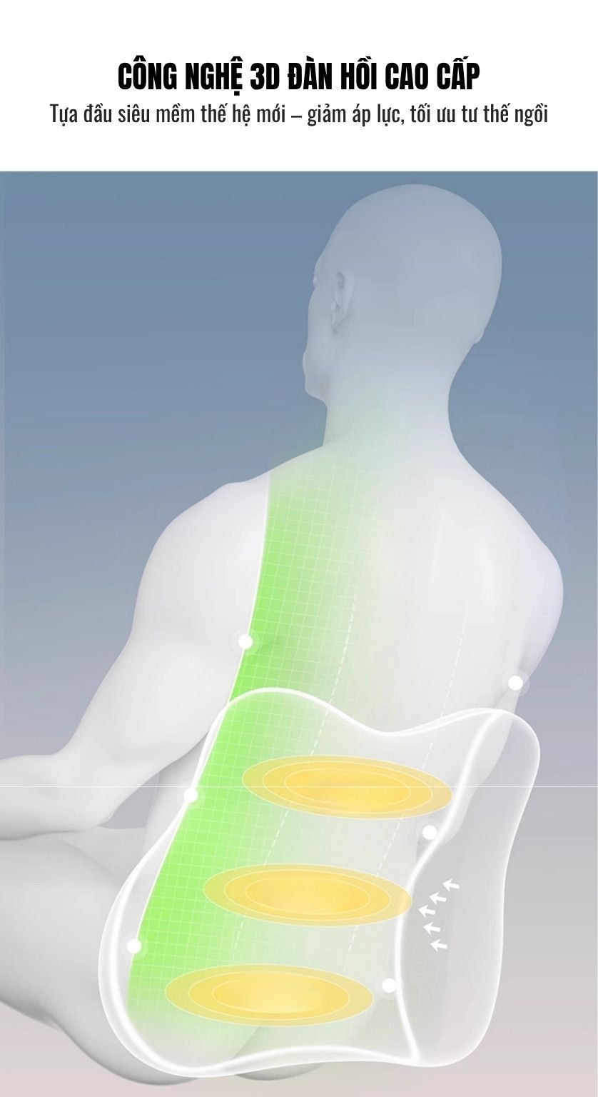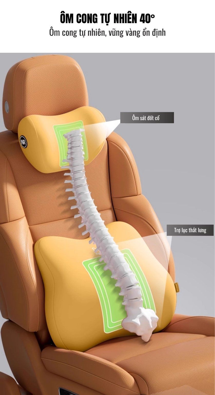 Thiết kế Công Thái Học:Ôm cong tự nhiên 40° ôm sát đốt sống cổ và ôm trọn đường cong thắt lưng. Giúp nâng đỡ và giảm áp lực lên vùng cổ và vai, mang lại sự thoải mái tối đa và tối ưu tư thế ngồi.