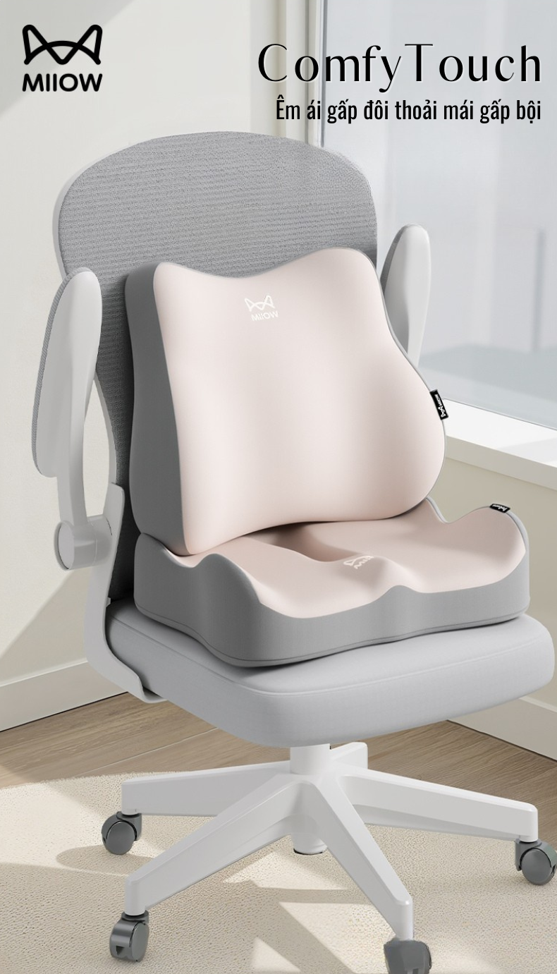 Đệm ngồi công thái học The ComfyTouch - giải pháp hoàn hảo cho dân văn phòng, tài xế hay bất kỳ ai phải ngồi lâu mỗi ngày. Thiết kế W lõm đôi ôm trọn vùng hông, kết hợp rãnh thoáng khí giữa giúp giảm áp lực lên xương cụt, giữ dáng ngồi chuẩn và ngăn tê mỏi hiệu quả. Chất liệu memory foam 52D đàn hồi cao mang đến cảm giác êm ái, nâng đỡ tự nhiên mà vẫn thoáng mát suốt nhiều giờ liền. Với Miiow, mỗi phút giây ngồi làm việc đều trở nên nhẹ nhàng, thoải mái và tràn đầy năng lượng.