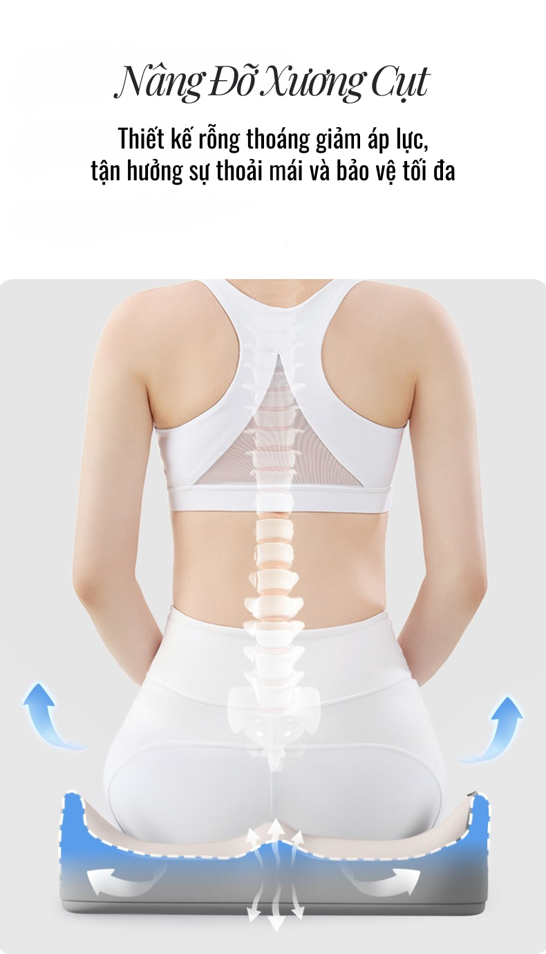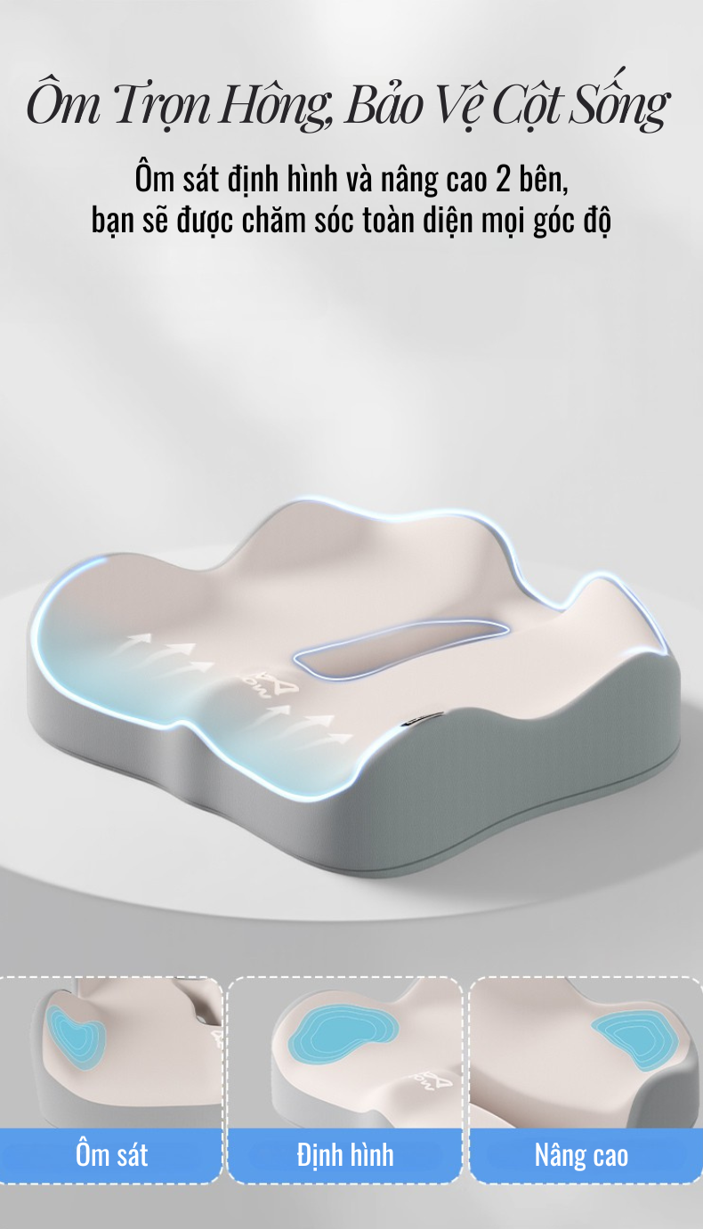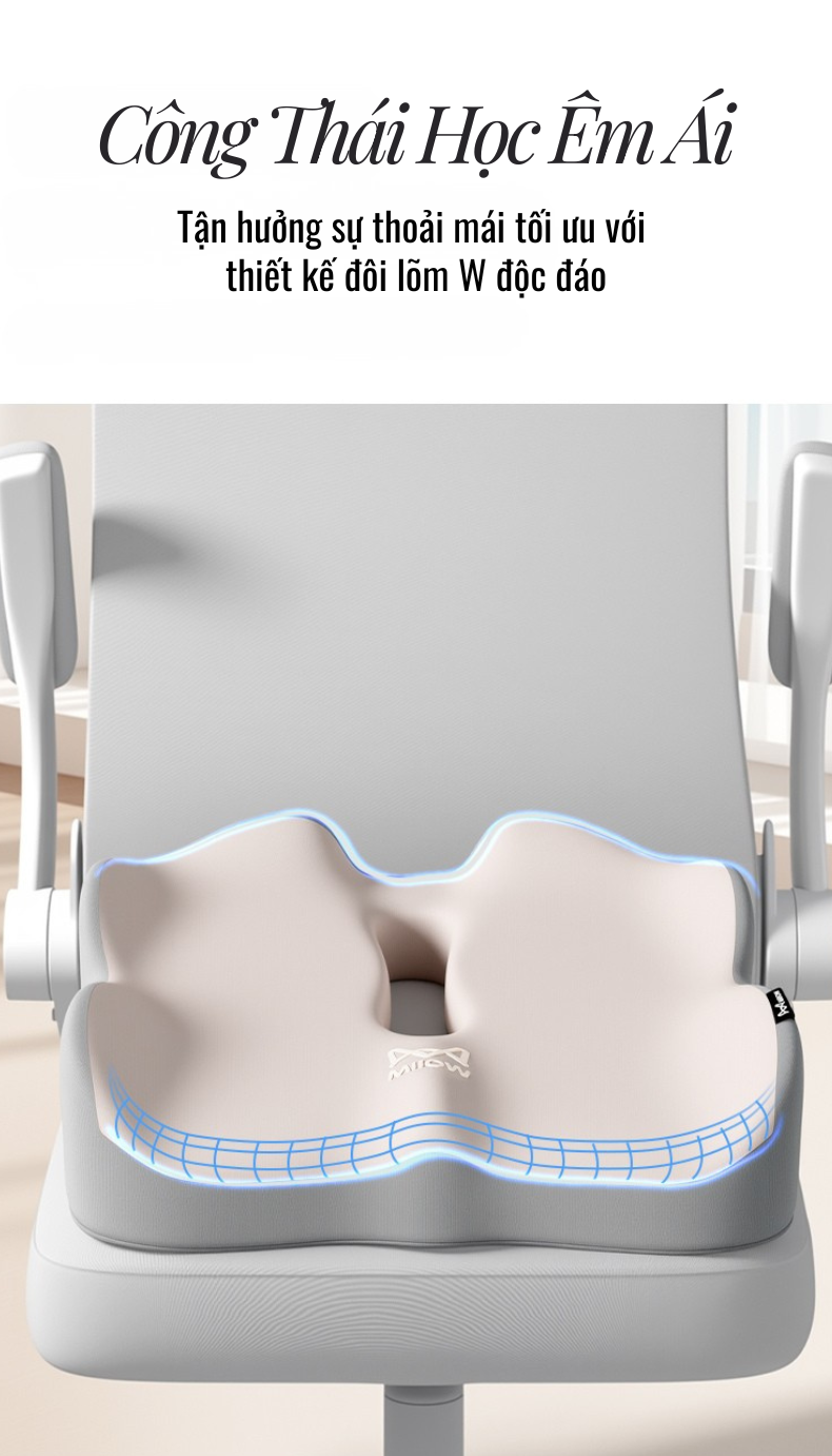 - Thiết kế công thái học chuẩn dáng người châu Á – giảm đau mỏi hiệu quả: Cấu trúc W lõm đôi ôm trọn hai bên mông giúp phân tán áp lực đồng đều, giảm tê mỏi khi ngồi lâu. Phần rỗng giữa vùng xương cụt giúp giảm chèn ép, tránh đau nhức và bảo vệ cột sống thắt lưng. - Công nghệ “Trung không nâng đỡ” – mát mẻ, thoáng khí, không bí hơi: Lớp giữa 12cm rỗng khí giúp vùng mông luôn được thông thoáng, hạn chế đổ mồ hôi khi ngồi lâu. Khả năng lưu thông không khí 360°, giảm tích nhiệt, tạo cảm giác dễ chịu suốt ngày dài. - Ruột đệm Memory Foam 52D cao cấp – đàn hồi, êm ái, bền lâu: Công nghệ mút nhớ 52D giúp đệm ôm theo đường cong cơ thể, giảm sốc và đàn hồi chậm ổn định. Giữ form nguyên vẹn sau thời gian dài sử dụng – không xẹp, không biến dạng. - Thiết kế phân vùng 4 chức năng – hỗ trợ toàn diện: Vùng nâng đỡ hông 360° - Vùng lưu thông máu cho đùi - Vùng chống trượt nâng phía trước - Vùng thông khí trung tâm - Chất liệu kháng khuẩn, thoáng mát – cảm giác “chạm là mát”: Vải bọc kháng khuẩn thế hệ mới, mềm mịn như da em bé, chống bám mồ hôi và vi khuẩn.