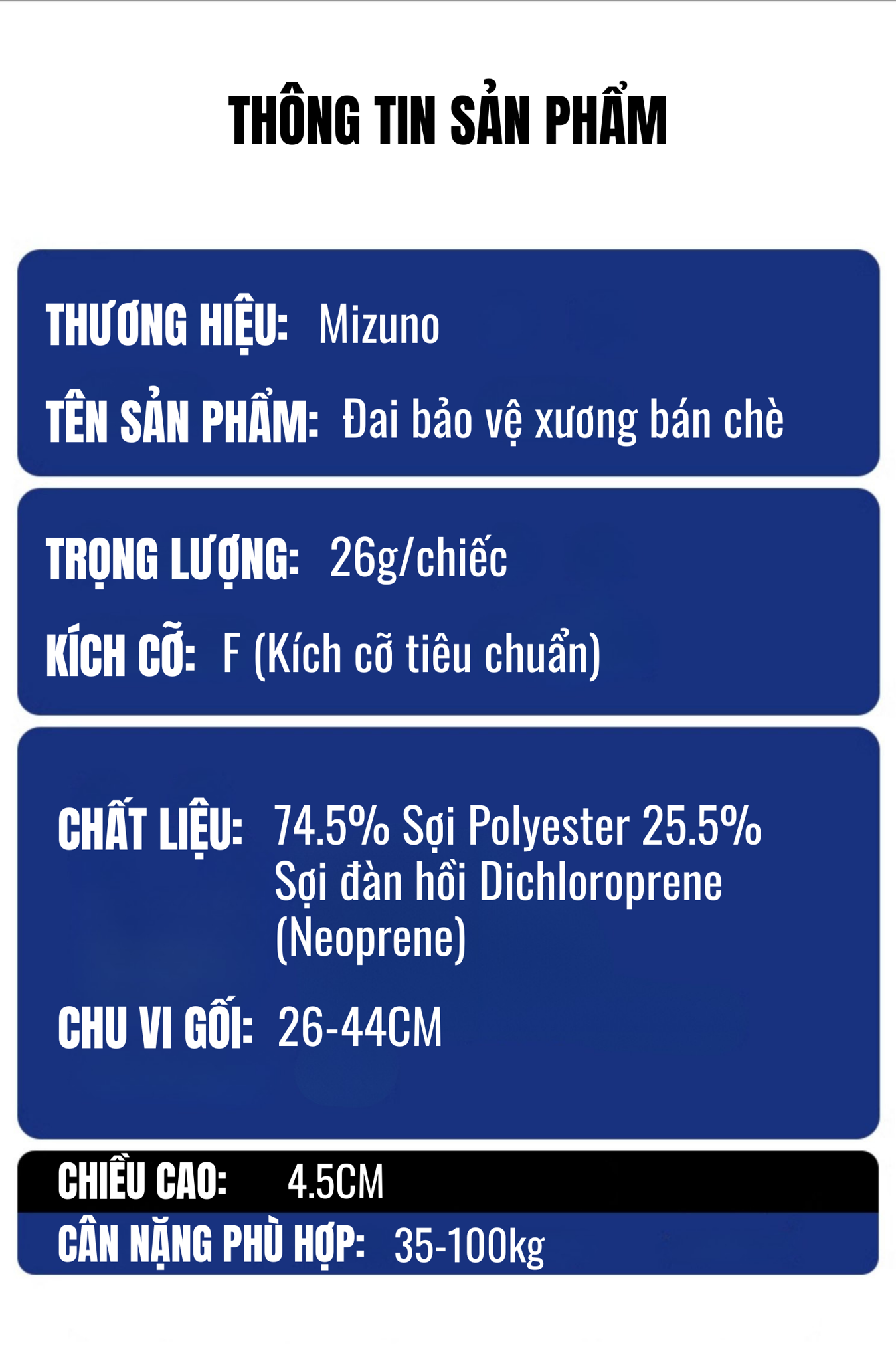 Đặc điểm nổi bật:Thiết kế ôm sát, cố định chắc chắn, hạn chế xê dịch. Thoáng khí, thấm hút mồ hôi tốt. Hỗ trợ hơn 100 môn thể thao và 10.000+ trường hợp phòng ngừa chấn thương. Phù hợp cho người từ 40-100kg.