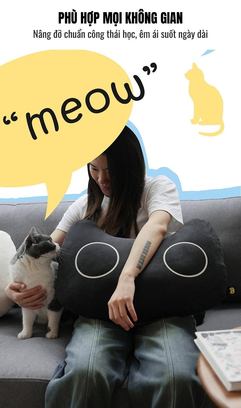 Thiết Kế Độc Đáo Gợi Cảm Xúc: Thiết kế hình mèo (Mimi) đáng yêu, mang lại cảm giác ấm áp, bình yên và là sự kết nối cảm xúc với thú cưng, khác biệt hoàn toàn với gối tựa truyền thống.