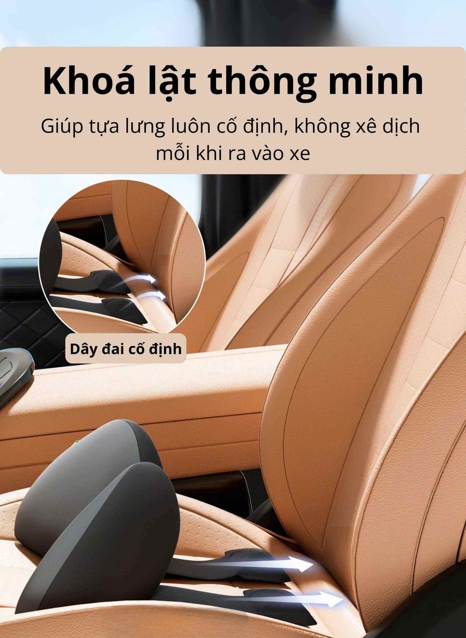 Ổn Định Tuyệt Đối: Trang bị Khóa lật thông minh giúp dây đai luôn giữ gối tựa lưng cố định, không xê dịch mỗi khi người dùng ra vào xe, giữ nguyên vị trí hỗ trợ.