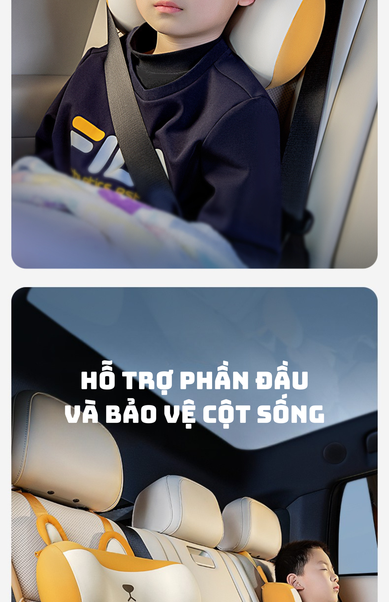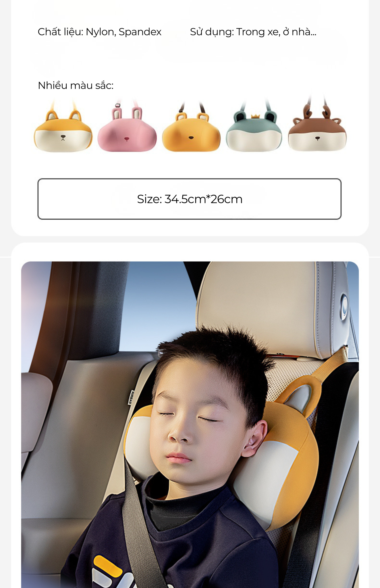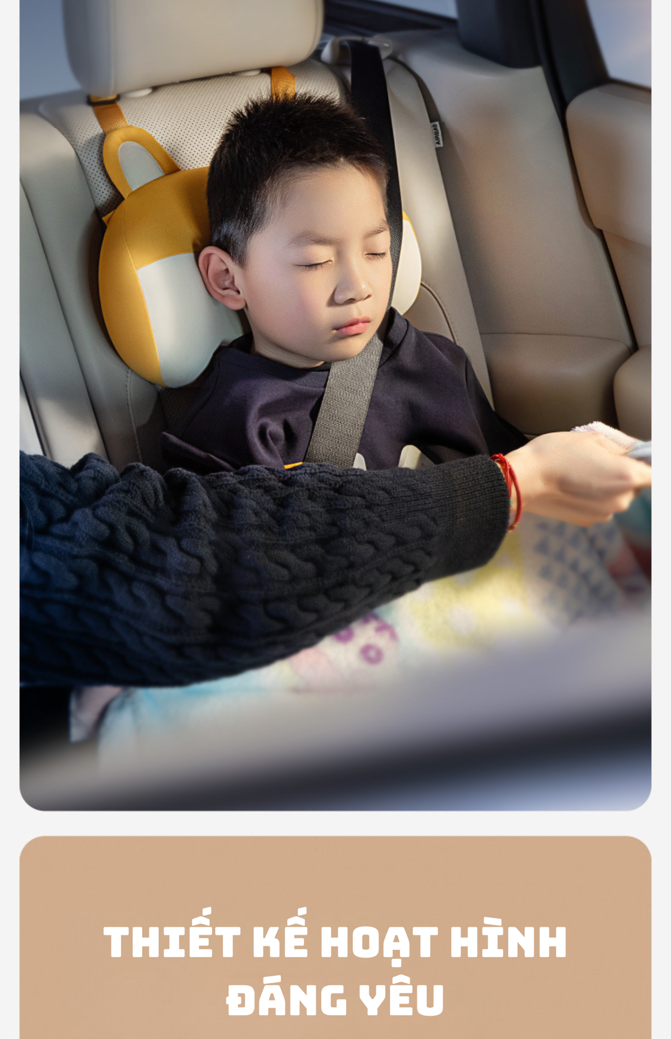 Lõi Đệm: cho độ đàn hồi chậm và khả năng nâng đỡ tốt. Độ an toàn: Đã được kiểm tra chất liệu Vải Bọc: Vải mềm mại, thoáng khí, thân thiện với da trẻ em. Cấu tạo: Thiết kế cong/bao bọc để ôm sát vùng cổ và gáy, ngăn đầu lắc lư khi ngủ ngồi.