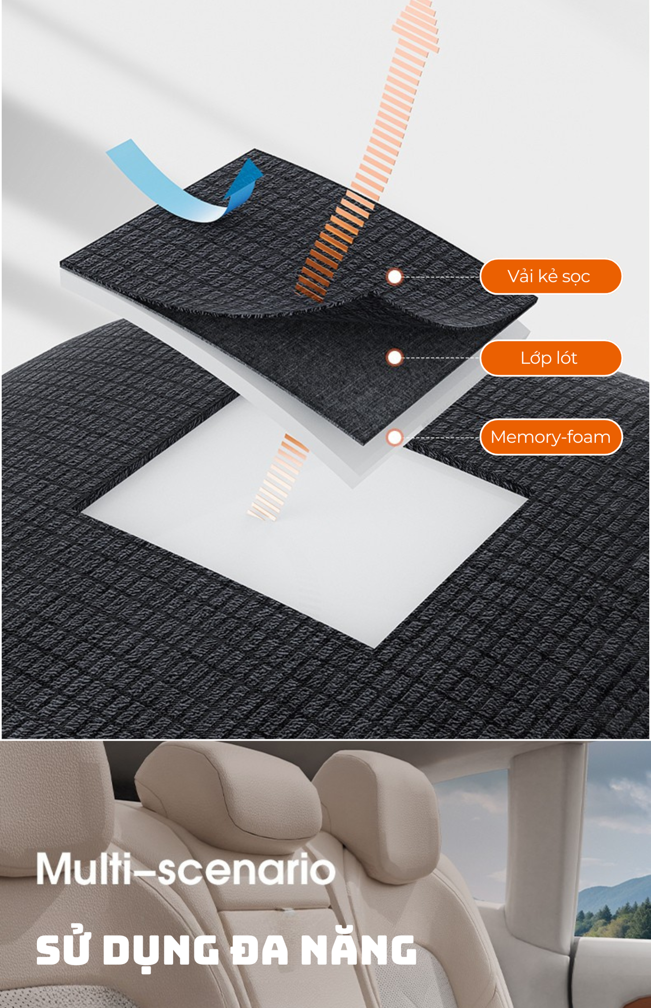 Cấu hình 3 lớp: Vải ngoài (Vải lưới bắp/Dệt kim mật độ cao) + Lót thoáng khí + Lõi nhớ.
