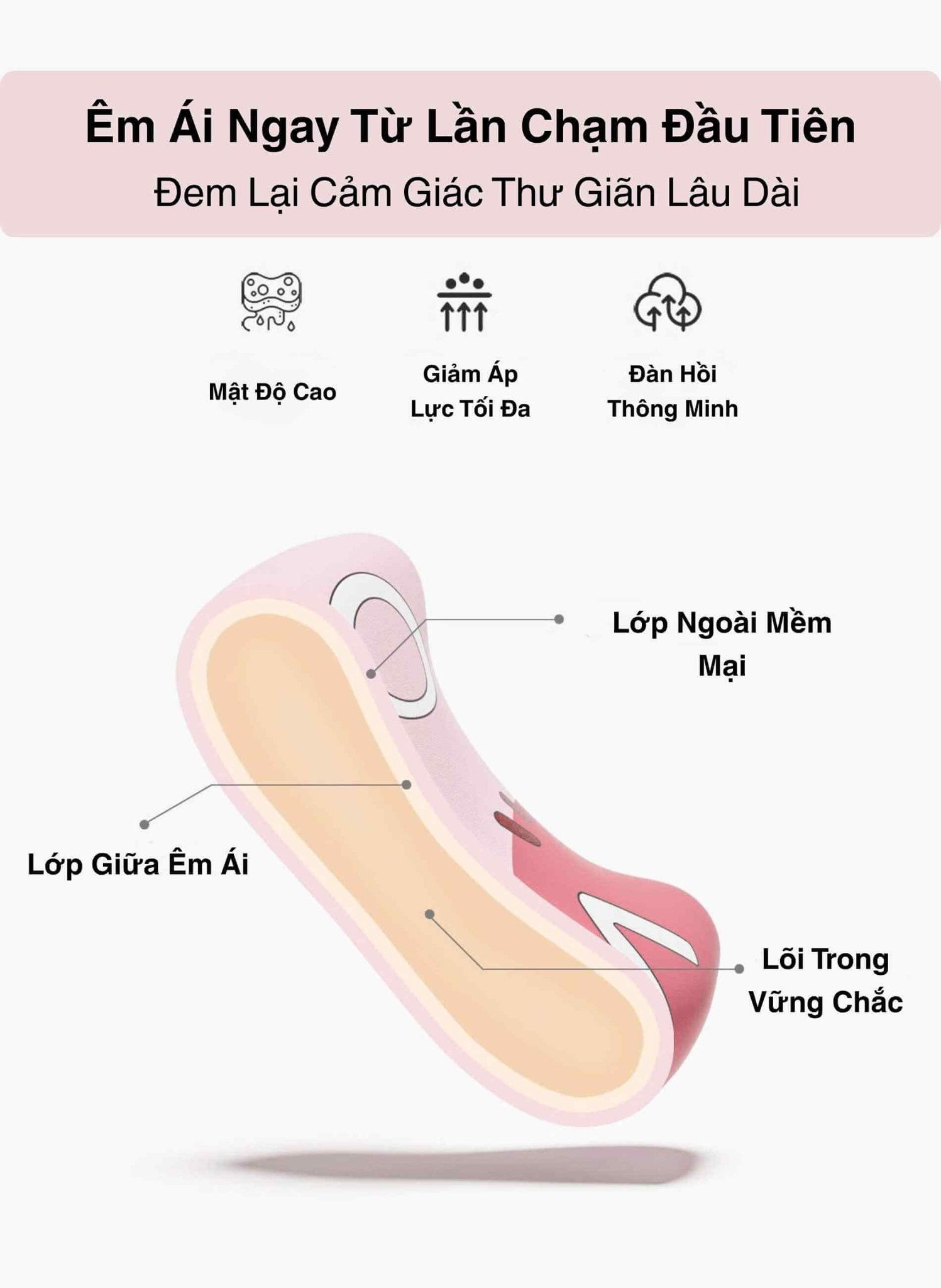 Giảm Áp Lực Tối Đa & Đàn Hồi Thông Minh: Lõi Memory Foam giúp Giảm Áp Lực Tối Đa và Đàn Hồi Thông Minh, mang lại cảm giác Êm Ái Ngay Từ Lần Chạm Đầu Tiên và giúp thư giãn sâu.