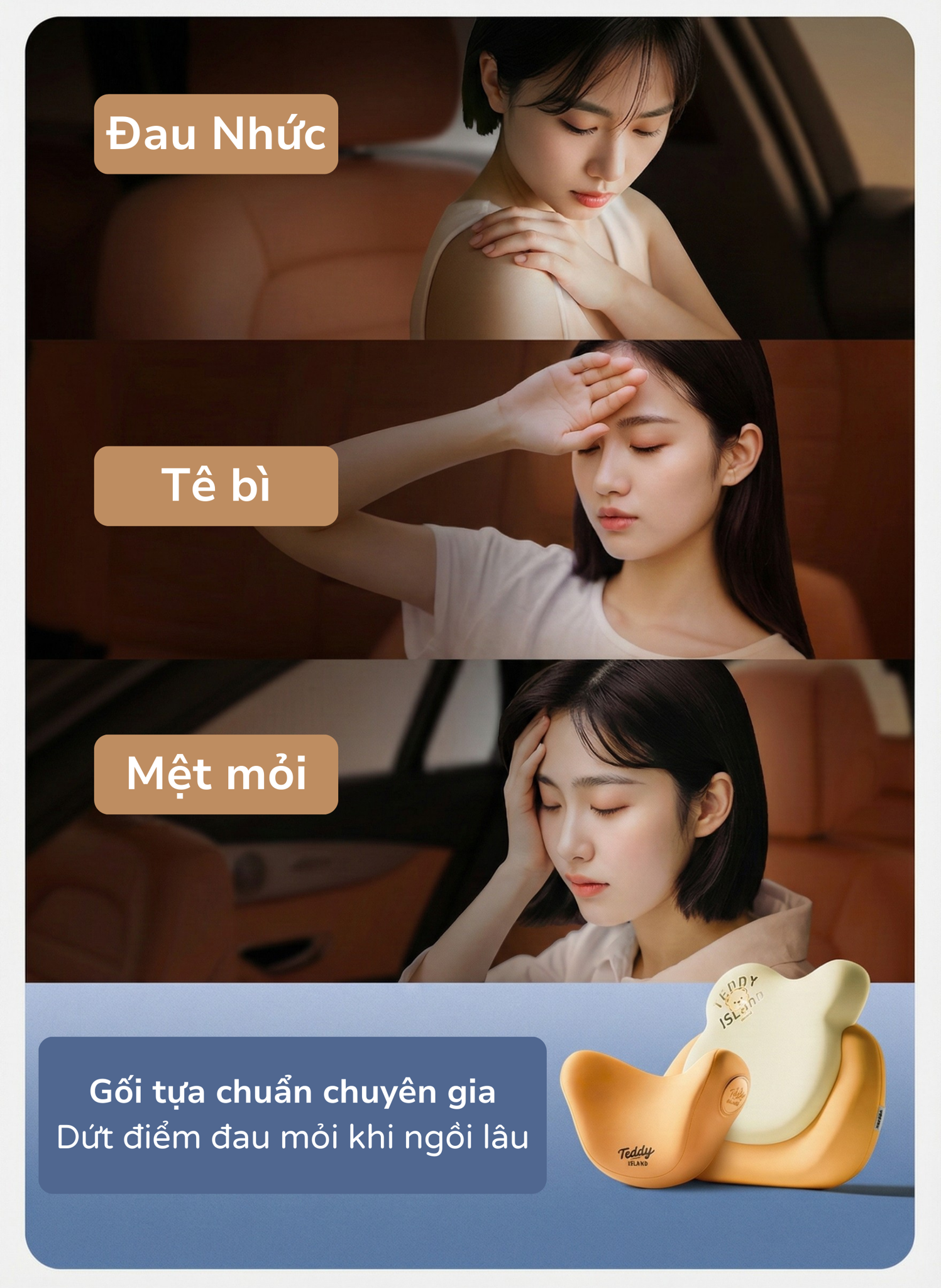 The Teddy Bear là dòng gối tựa cao cấp, sản phẩm tiêu biểu cho nhiều năm đúc kết công nghệ và nhiều lần nâng cấp cải tiến. Sản phẩm được thiết kế bằng cả tâm huyết để giải quyết các vấn đề bảo vệ khi ngồi lâu hoặc lái xe đường dài. Với sự hỗ trợ toàn diện, gối giúp xóa tan tình trạng đau nhức, tê bì, và mệt mỏi khi ngồi lâu, mang lại cảm giác thoải mái trên mọi hành trình.